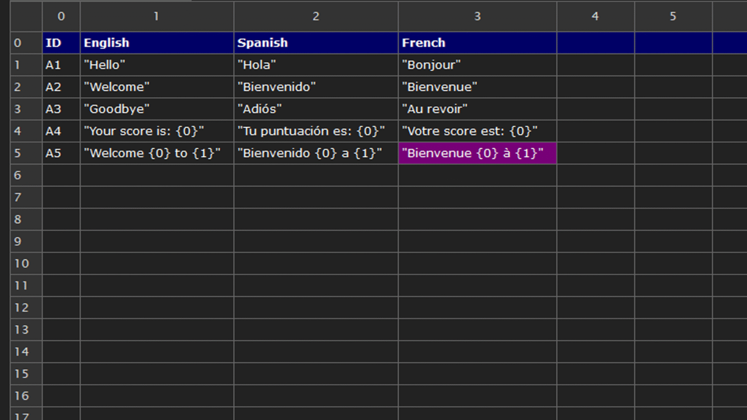 The CSV format is simple, human-readable, and fully compatible with tools like Excel, Google Sheets, or any text editor. You can include as many languages as you need — simply add more columns (e.g. Italian, German, Portuguese). Each new column represents one language available at runtime.