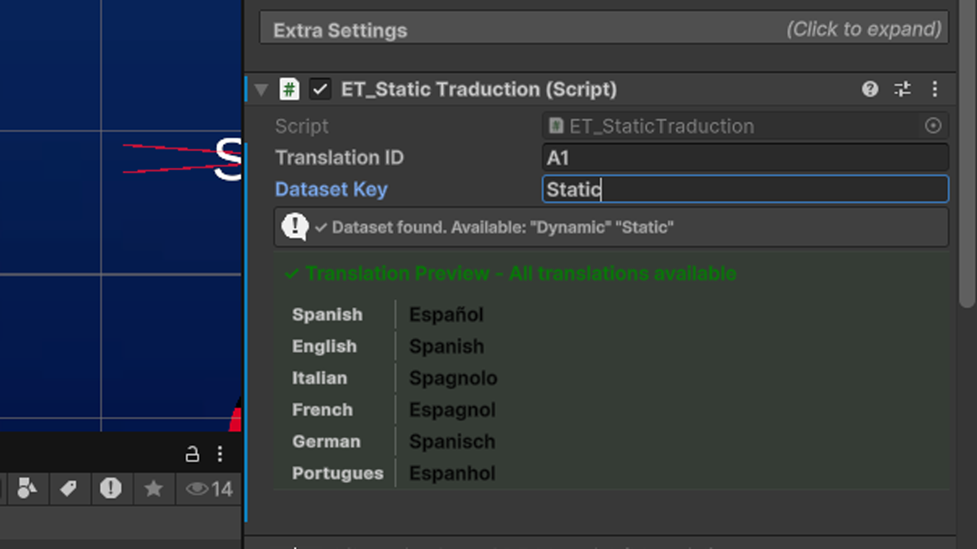 Use ET_StaticTraduction for texts that never change at runtime, such as menu buttons, labels, or titles.